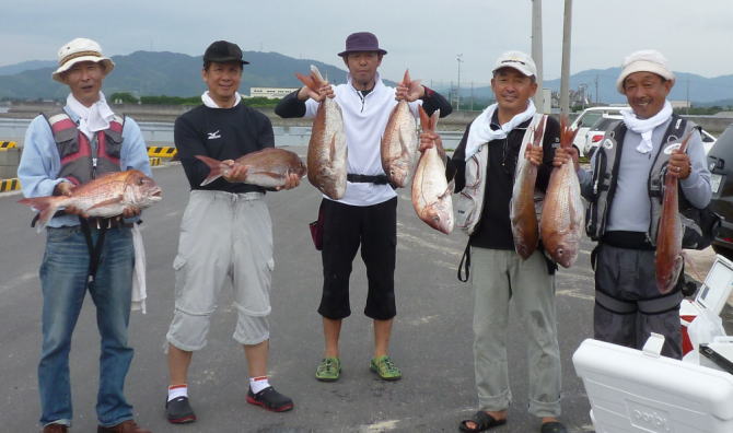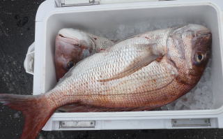 比呂丸の釣報告代2段です。 ![]() 今回は昼釣で6:00出港しました。 乗客は私のグループ5人と、他のグループ2人で計5人です。 比呂丸の船長は鯛狙いとなると鯛専門にポイントとを探してくれます。 今回のメンバーも鯛狙い専門のメンバーでした。 実は、私は自慢ではないが今まで鯛釣りに行って鯛を釣ったことがありません。 しかし、さすが比呂丸の船長、今回は違いました。 比呂丸での鯛の釣り方はいわゆるテンヤ釣りです。 1.まず、イワシの大群を見つける 2.そこに幹糸5号ハリス3号くらいのサビキ仕掛けでイワシを釣る 3.イワシが釣れたらそのまま底まで仕掛けを落とす 4.底についたら少し上げる 後はそのまま待ったり、かなり上まで上げたりで釣り人により様々、 色々とノウハウがあるようです。 ですから必然的に釣果はベテランほど多いということになります。 多い人は巨大な鯛を3匹ヤズ1匹ハマチ1匹釣った人も いました。 それだけ釣れば横長の大きなクーラーでも一杯になります。 私は鯛は1匹しか釣れませんでしたが、、なにしろ始めて 釣れた鯛なの で興奮してしまい、船長が緩めろとしきりに 言うのですが何を緩めたらいいのか分からず慌てふためい てしまいましたが、ようやく糸が切れないようにビンディング の強さを緩めなさいと言う事でビンデングを調整し無事取り 込むことができました。 50cmくらいの鯛でしたが、すばらしい引きに感動しました。●70cmの鯛 大きめのクーラーですが入りきりません |