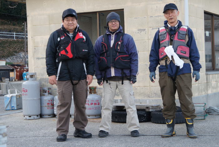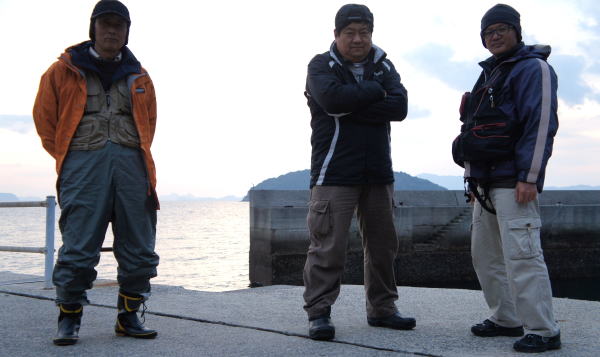 | 今回の釣りは極寒のメバル釣りだ。 当初の参加予定者は5人、一人減り二人減りついには写真の3人となってしまった。 いきなりつまづいてしまった出だしだが、3人ともやる気満々、見よこの勇士。 岩国港から高速艇で約1時間で黒島到着。 それでも私達は釣れると信じ「おじいさん」と反対側の波止に陣取る。 いよいよ明日朝までの極寒の釣りがスタートだ。 ワクワク!! まずはサビキでアジを狙う。 アジは来ないが小さなメバルなら結構釣れる。 私達は小さなメバルを釣りに来たのではない。 あくまでも尺メバル狙いだ。 今は小さいが、暗くなればそのうち尺が来るだろうと我慢の釣り。 だが波止の隅から隅まで探るも一向に尺の来る気配が無い。相変わらずメバルが小さい。メバルではなくメバだ。 おかしい、こんなはずは無いのだ。極寒なのに。潮のせいか? 潮のせいと諦め、24時くらいにカップ麺、カレーライス、雑炊等の夜食をとる。極寒の中での暖かい食事は格別だ。 夜食も食べ終わり、さーこれからが尺の時間だと意気込み波止に向かう。 しかし状態は変わらず、むしろ悪化していた。 メバすら釣れない。 結局朝7時まで一睡もせず釣ったが、尺が来ることはなかった。 ところが、「おじいさん」は違っていた。 6時位から私が釣っていた辺りで、カブラ仕掛けで釣り始めた「おじいさん」。 最初は暗くてよく分らなかったが、明るくなってから何気なく見ていると、尺まではいかないが20cmオーバークラスをバンバンとあげていた。 どうも「朝まずめ」のカブラはよく釣れる様だ。 下の写真は、単純なので次はカブラを挑戦してみる気になった私と一晩極寒徹夜をしても元気な二人。 という訳で今回は残念ながら魚の写真は無い。 ![]() |